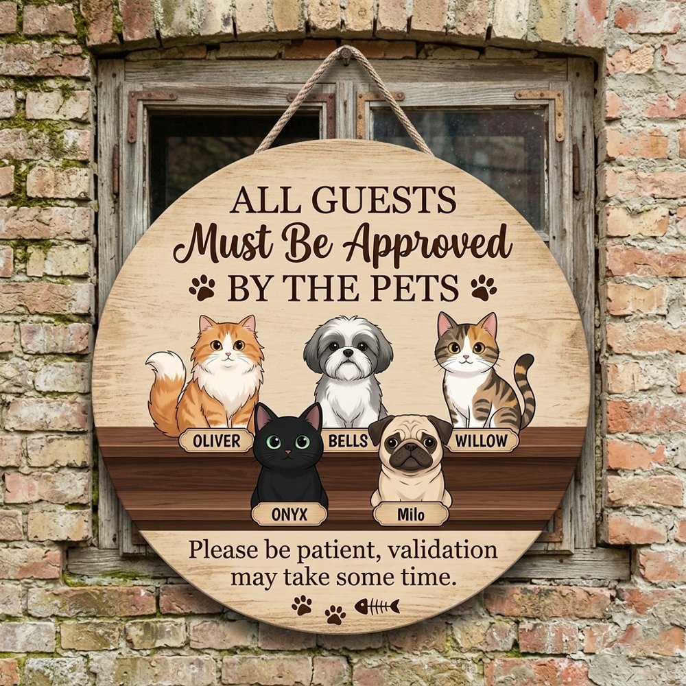 Personalized All Guests Must Be Approved By The Pets Wood Sign Custom Dog And Cat Names Funny Please Be Patient Validation May Take Some Time Decor