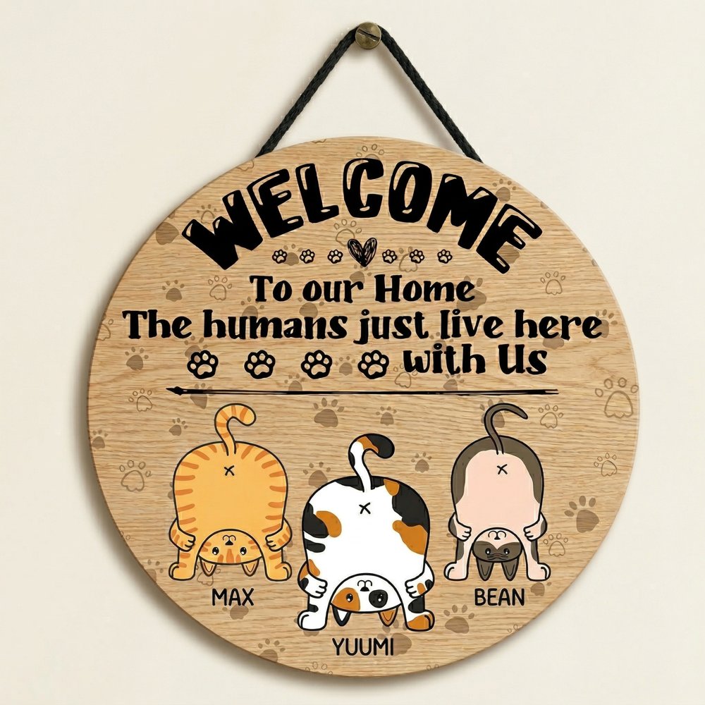 Personalized Cat Welcome Sign With Custom Names Funny Printed Wood Plaquethe Humans Just Live Here Unique Housewarming Gift For Multi-Cat Homes