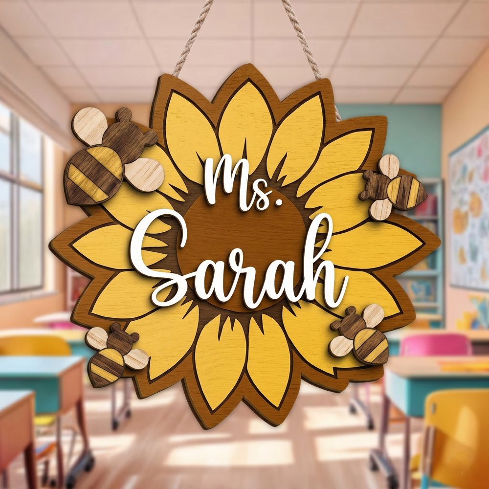 Personalized Sunflower Teacher Name Sign Custom Wooden Bumblebee Door Hanger Unique Shape Classroom Decor Teacher Appreciation Gift
