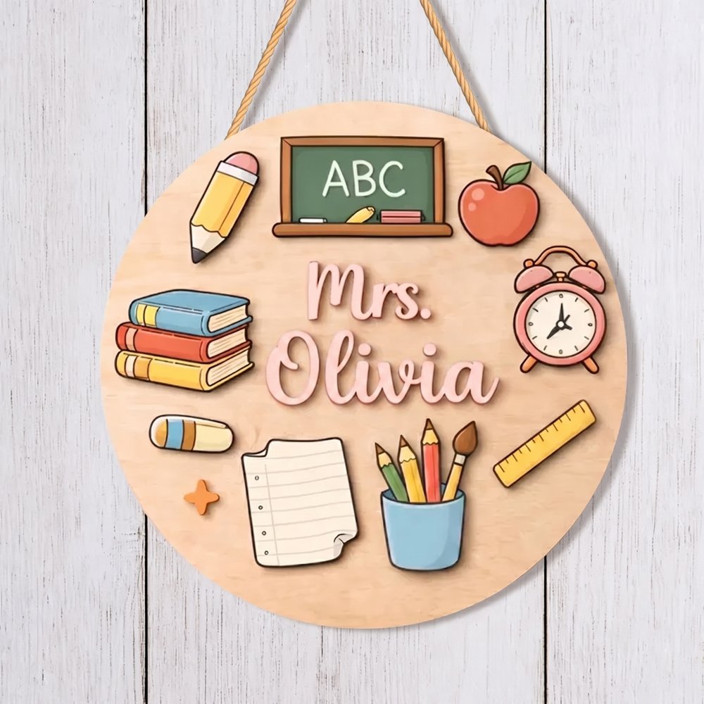 Personalized Teacher Classroom Sign Custom Teacher Name Wood Decor With School Supplies Icons Appreciation Gift Round Wooden Sign