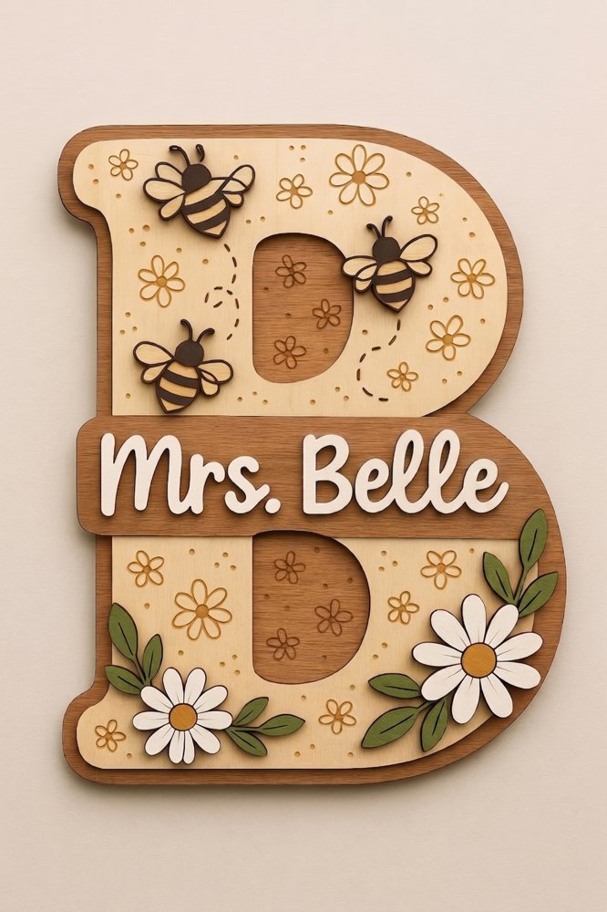 Personalized Teacher Initial Name Sign Custom Wood Door Hanger Wooden Sign With Bees And Daisies Appreciation Gift