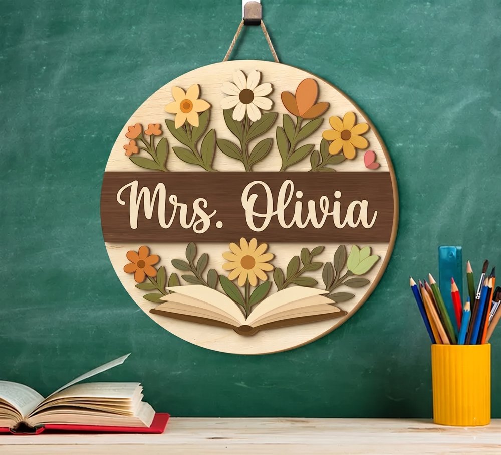 Personalized Teacher Name Classroom Sign Custom Floral Book Wood Door Hanger