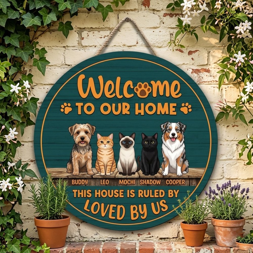 Personalized This House Is Ruled By Loved By Us Wood Sign Custom Dog And Cat Names Wall Art Funny Multi Pet Owner Entryway Door Decor