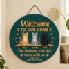 Personalized Welcome To Our Furry Family Home Wood Sign Custom Cat Names And Illustrations Wall Art The Humans Just Live Here With Us Door Decor
