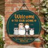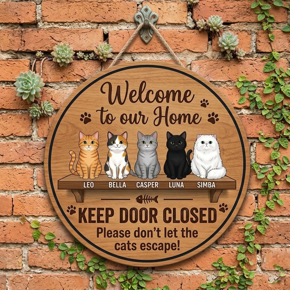 Personalized Welcome To Our Home Wood Sign Keep Door Closed Please Don’t Let The Cats Escape Custom Pet Names And Illustrations Hanging Plaque