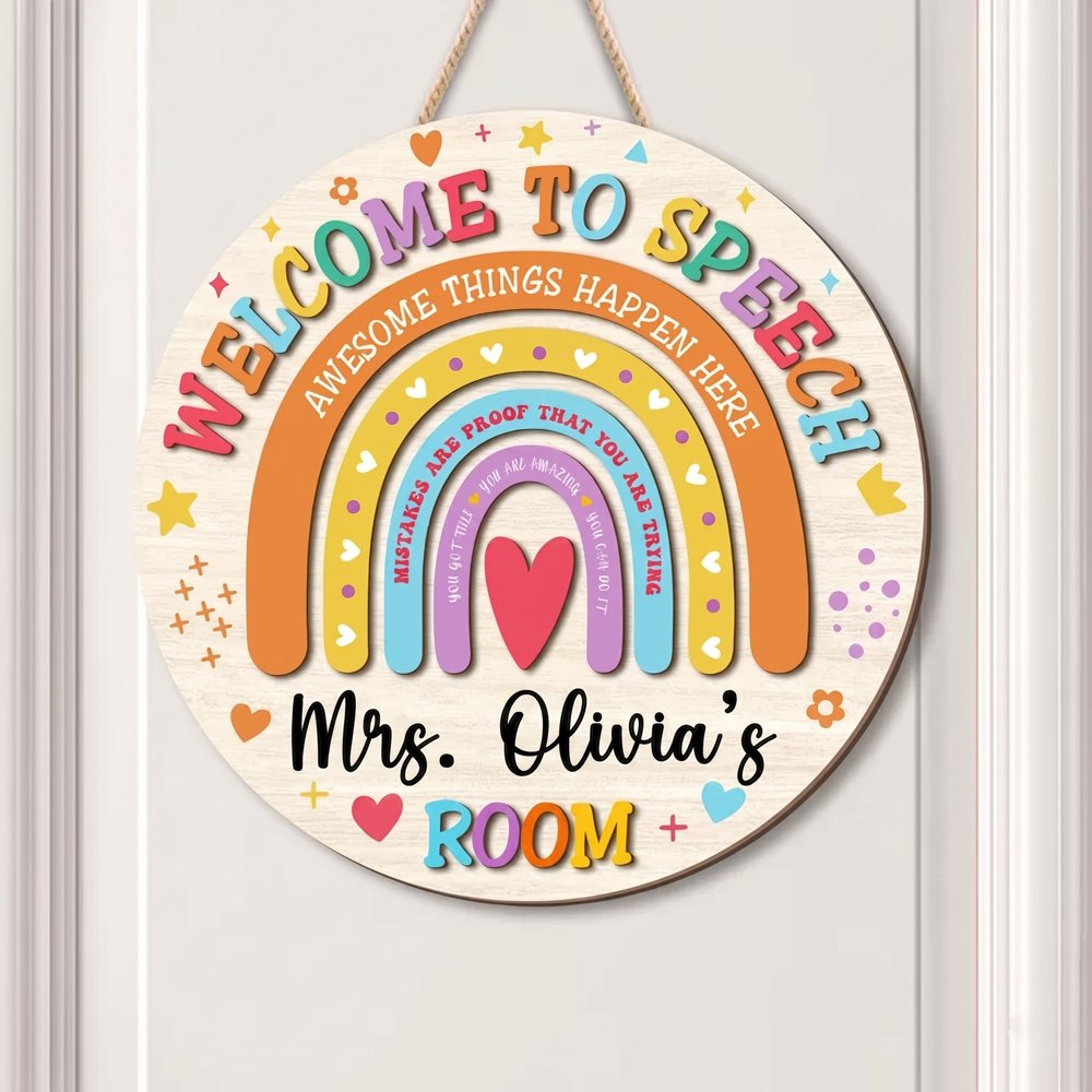 Introduce a unique vibe to your space with the “Personalized Welcome To Speech Door Sign Custom Rainbow Room Name Plate Slp Classroom Decor Round Wooden Teacher Gift”. This wooden piece is designed to catch the eye and fit perfectly on any door or wall, making it an instant standout in your decor.